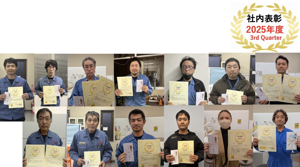 「見てくれている」実感が、次の力になる。 この制度の最大の特徴は、社員の業務を最も間近で見ている部長や課長が、その努力や成果をきめ細かく推薦することにあります。「目立つ成果」だけでなく、「陰の努力」や「周囲への配慮」も評価の対象です。3ヶ月ごとに推薦を基に選定が行われ、受賞者には社長から賞状と金一封が授与されます。2024年度は、延べ48名の個人と1部門が表彰されました。
