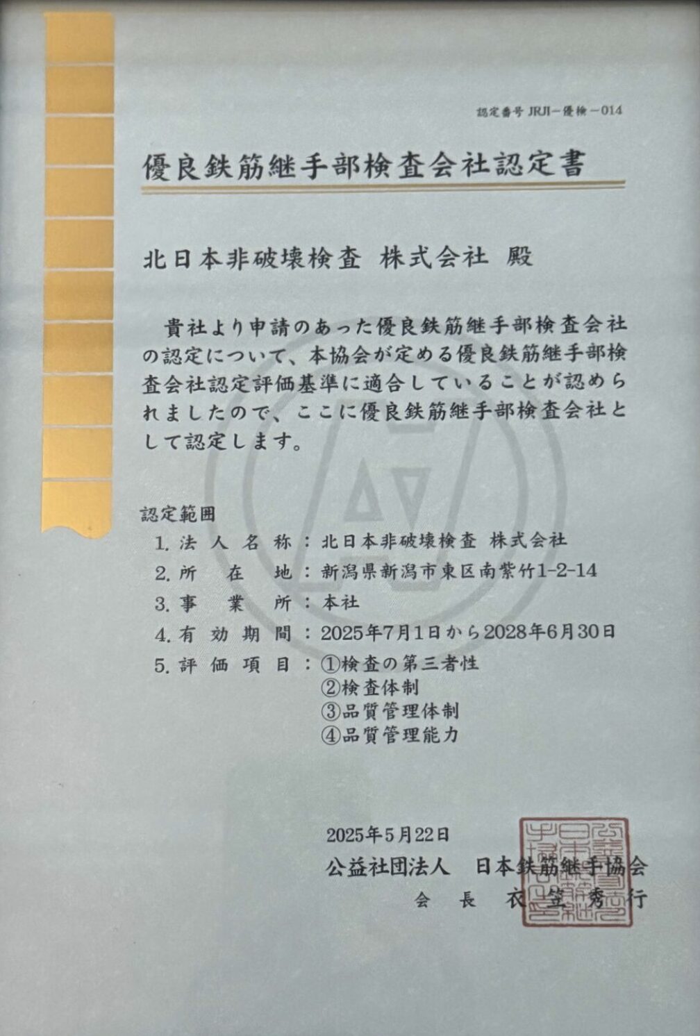 鉄筋コンクリート構造物の安全性に不可欠な鉄筋継手部においても、当社は優良鉄筋継手部検査会社として認定されています。この認定は、以下の厳正な評価項目をクリアした証です。