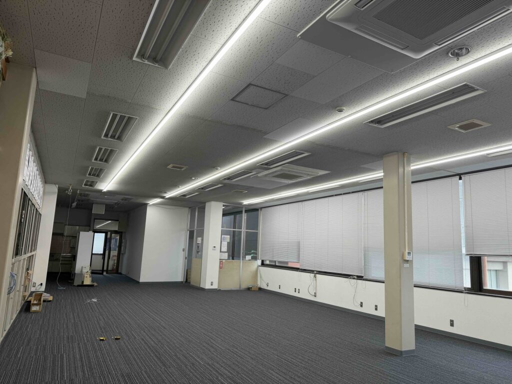 広々としたフロアを貫くように設置された3本の直線光。 これにより、以前とは比較にならないほど「非常に明るい空間」が実現しました。