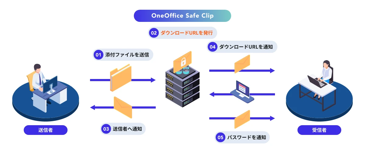 「Safe Clip」は、これらの課題を解決するソリューションです。添付ファイルを自動的にWebダウンロード形式に変換し、安全なダウンロードURLとパスワードをメールで分離して送信します。これにより、万が一メールを誤送信してしまった場合でも、パスワード通知をキャンセルすることで情報漏洩を未然に防ぐことが可能となります。